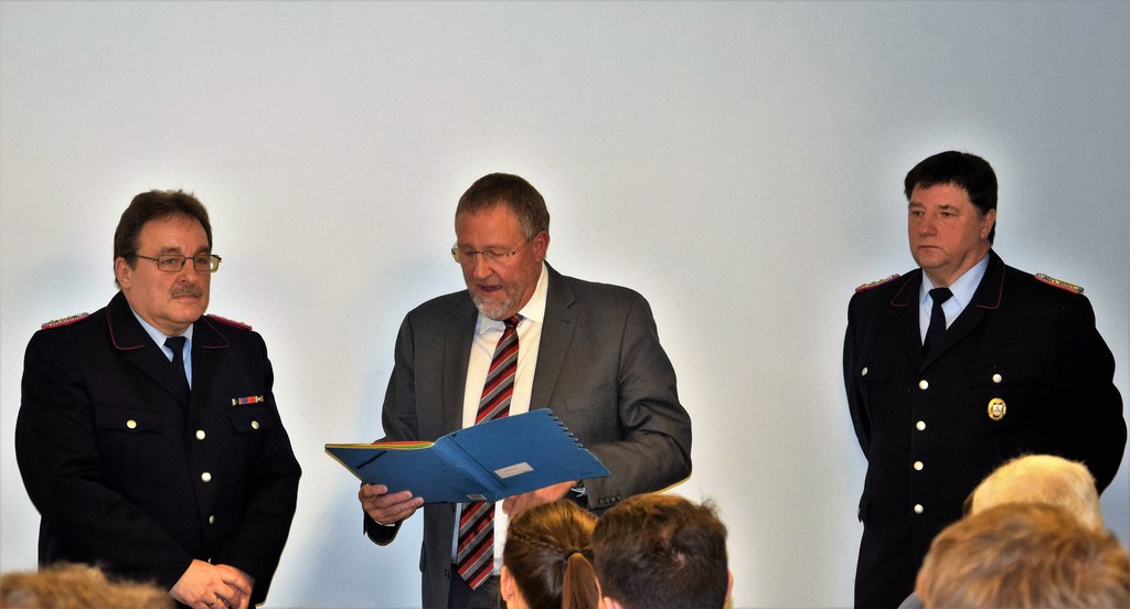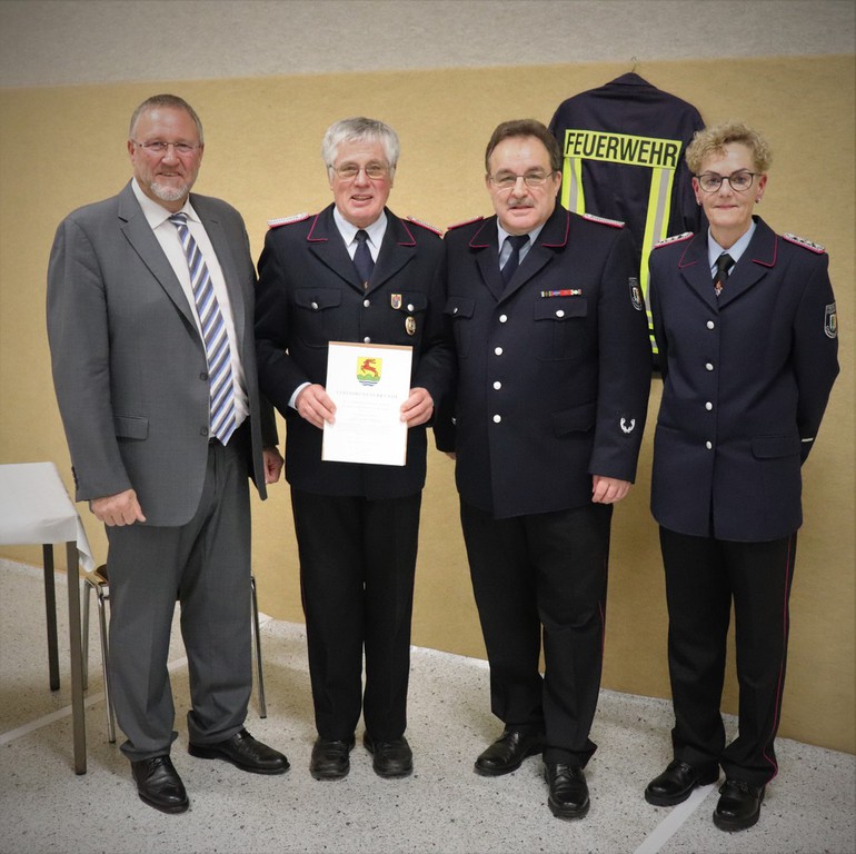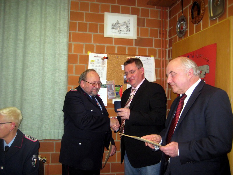 Befördert wurden in diesem Jahr Lucas Pohlmann zum (Feuerwehrmann), Bärbel Pohlmann zur (Hauptlöschmeisterin) und Andreas Ziegler wurde (Erster Hauptlöschmeister). Geehrt wurde Hauptlöschmeister Timo Zoske. Für seine langjährige Tätigkeit im Brandschutz erhielt er das Ehrenzeichen des Landesfeuerwehrverbandes 25 Jahre. Kamerad Horst Hermes, erhielt für seine 50- jährige Tätigkeit im Feuerwehrwesen, das Ehrenzeichen des Landesfeuerwehrverbandes, welches ihm durch Samtgemeindebürgermeister Rainer Mertens überreicht wurde. Der Landtagsabgeordnete, Duingens Bürgermeister und langjähriges Mitglied unserer Feuerwehr Klaus Krumfuß überbrachte uns die Grüße aus Rat und Verwaltung und bedankte sich für unseren Einsatz für die Gemeinschaft. Aufgrund der neuen Konstellation in den Strukturen der neu gegründeten Samtgemeinde Leinebergland, konnten in diesem Jahr gleich mehrere Samtgemeindebrandmeister von uns begrüßt werden. SGBM Michael Basse, der noch in Tätigkeitsbereich Duingen verantwortlich zeichnet, konnten wir mit seinem Vertreter Jörn Brökelmann begrüßen. Aus dem Verantwortungsbereich Gronau war unser neu gewählter SGBM Frank Kirchner anwesend, dessen Amt in Kürze noch vom Samtgemeinderat bestätig werden muss, bevor er offiziell in Amt und Würden sein wird. Außerdem konnten wir den stellv. Abschnittsleiter des Brandabschnittes West, Thomas Reitz begrüßen. Brandabschnittsleiter Frank Kiehne war in diesem Jahr entschuldigt abwesend.