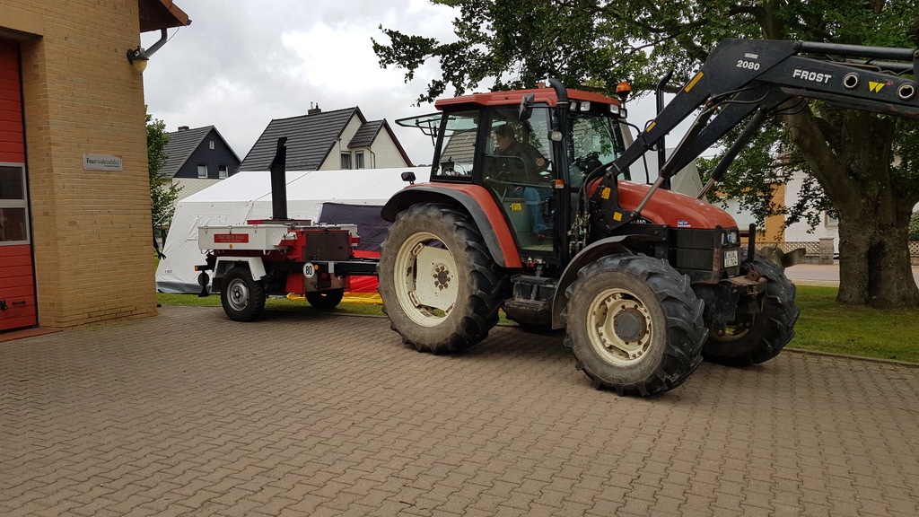Für die Verpflegung wurde in diesem Jahr die Feldküche der Feuerwehr aus Alfeld angefragt. Die Feldküche musste bereits am Freitagnachmittag durch Heinrich Runge mit einem Traktor aus Alfeld abgeholt und aufgestellt werden. Kamerad Karl-Friedrich Winning (Alias K. F.) hat mit uns das Menü abgestimmt. In diesem Jahr sollte es Geschnetzeltes mit Spätzle geben. Hierfür hat K. F. bereits morgens um 8:00 Uhr die Feldküche angeheizt. Unzählige Kilo Schnitzelfleisch, Gewürze, Soßenbinder & Sahne mussten mehrere Stunden vorbreitet und gegart werden.