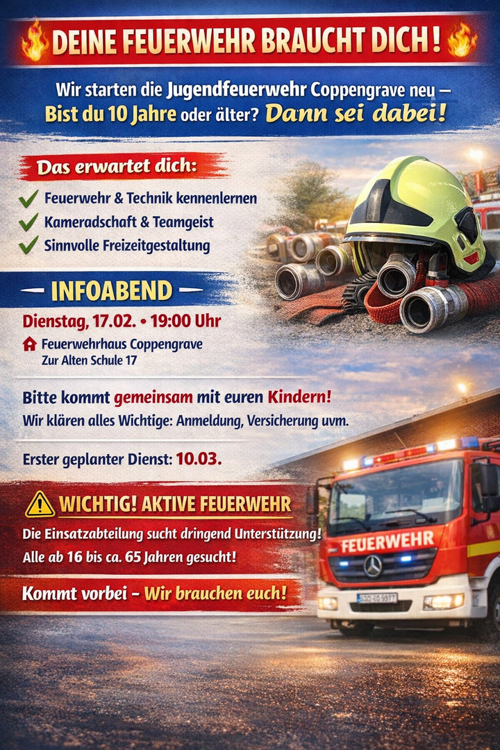 Schön, dass wir Sie auf unserer neuen Homepage begrüßen dürfen. Hier finden Sie ab sofort aktuelle Informationen über die Freiwillige Feuerwehr Coppengrave.